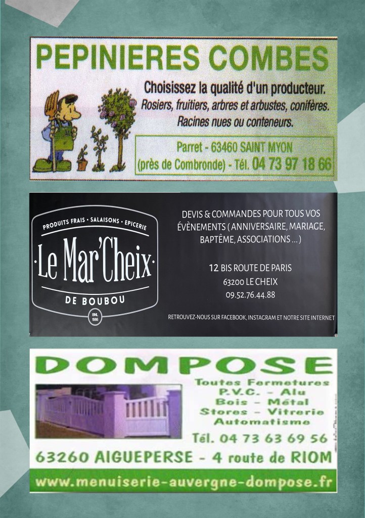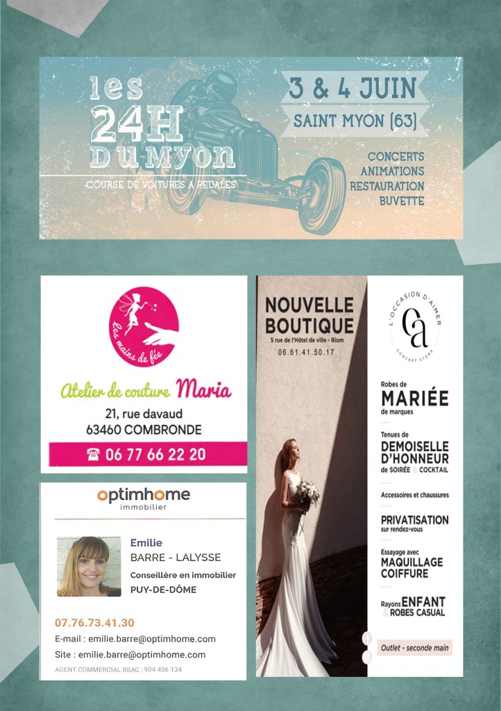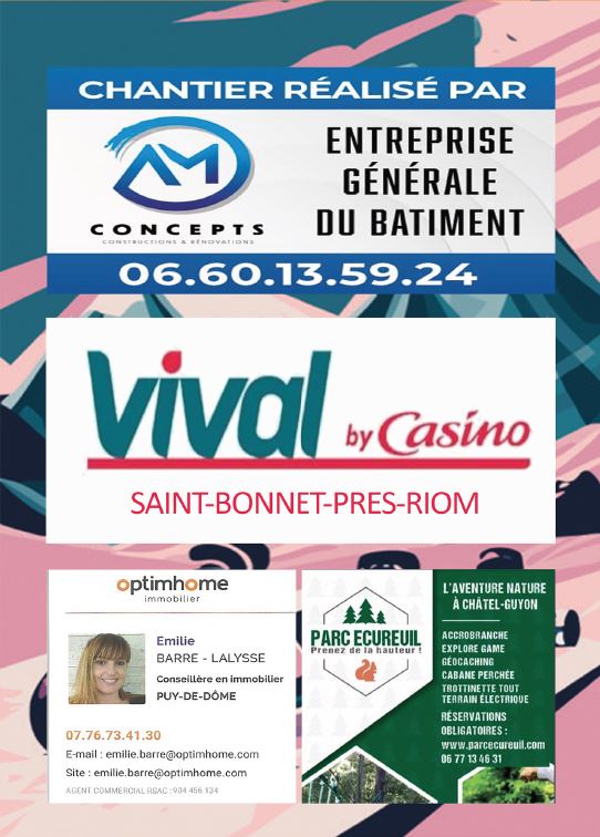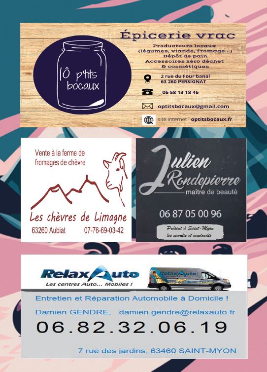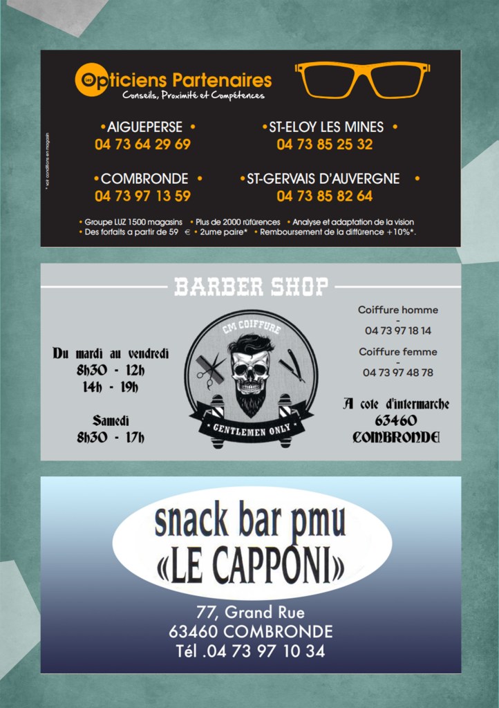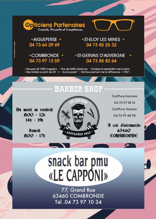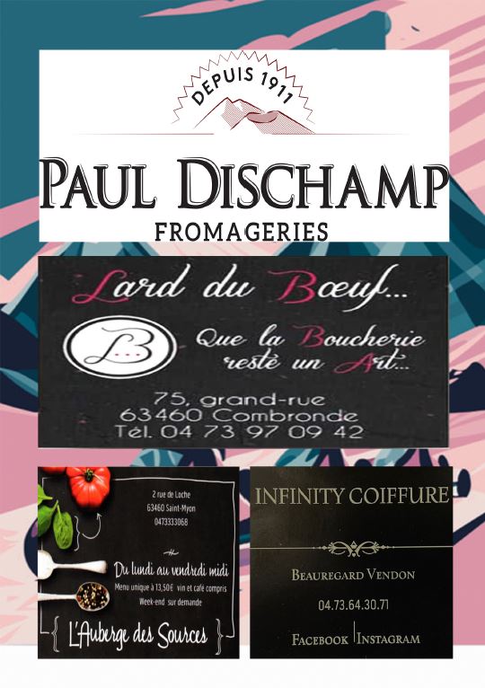 Les Opticiens Partenaires CM Coiffure Homme Barber Shop, Le Capponi, Garage Bafoil, La table de l’Aize, Le Cocon de Julie, Coiffeur Julien Rondepierre, Les chèvres de Limagne, Le coup de main, Les 24 Heures Du Myon, Flor Ever, Ô p’tits bocaux, Auberge des sources, VW OLD CARS, Dedee Artonne, Lard du Boeuf, Infinity Coiffure, Pépinière Combes Maucourt, Biocoop RiomSud, Relax Auto, Parc Ecureuil, Vival St Bonnet, AM Concept, Cinéma Arcadia, Cinéma la Viouze, La belle Roulotte, Valeyre Alexandra, MG Menuiserie, Hallwash, les Copains de Copeaux, ADS, DekraCombronde, H’Men Bien, Velorail du barrage des fades, #regionauvergnerhonealpes