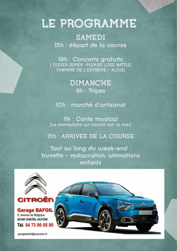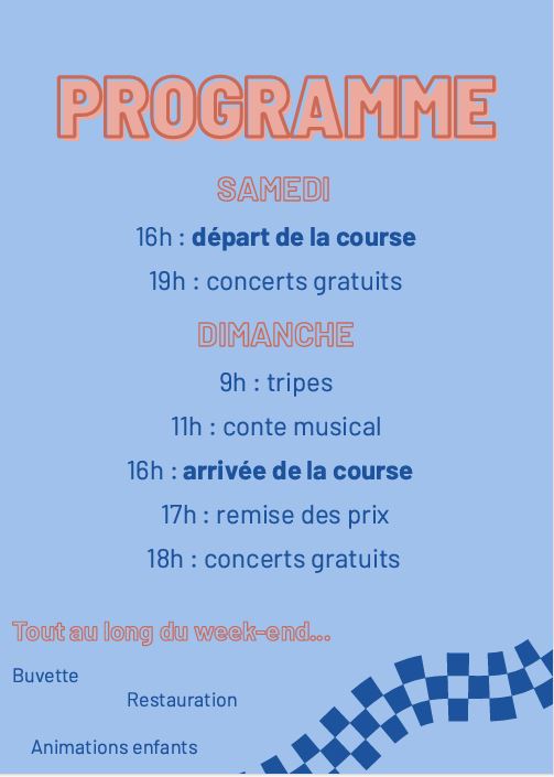 - Animations sur place: jeux ludiques, châteaux gonflables, tour du circuit à pied, visite des stands des équipes, buvette, restauration…